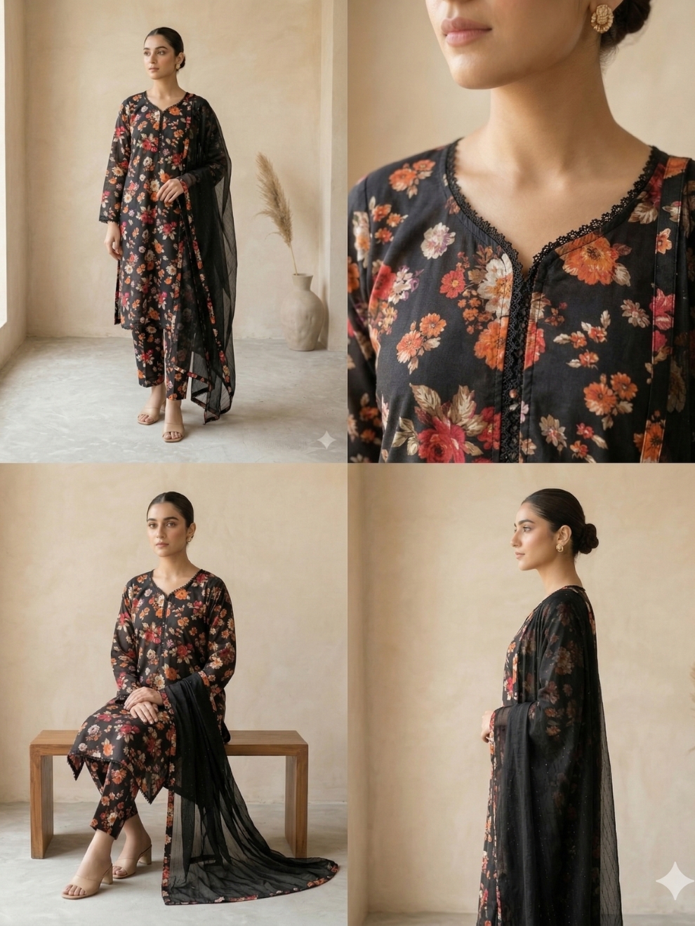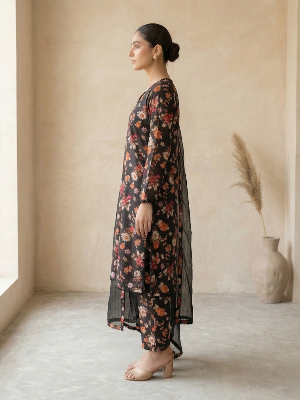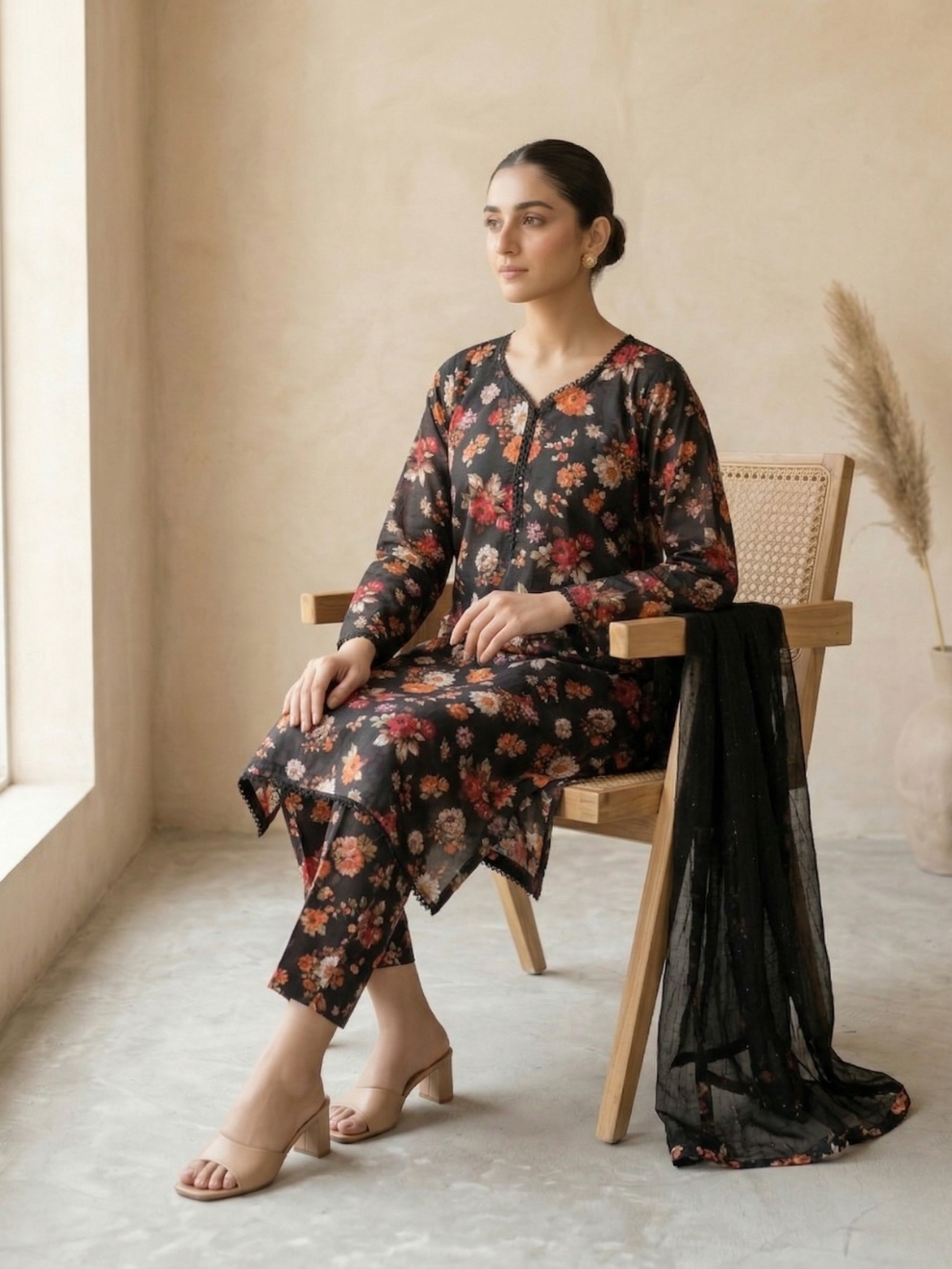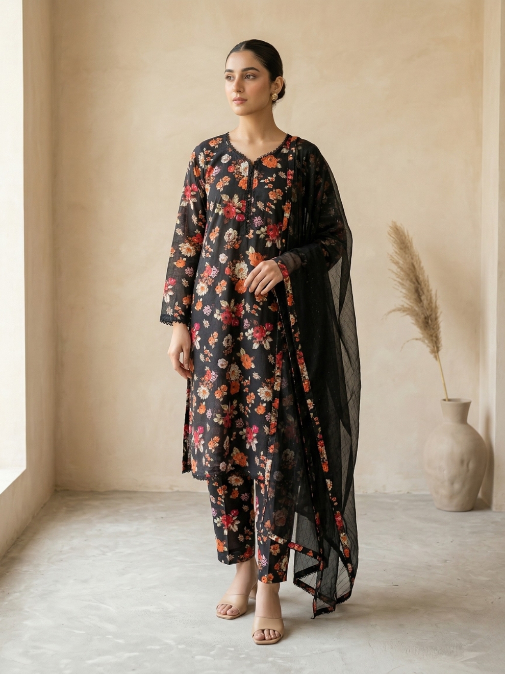 Dupatta A lightweight, sheer black dupatta accented with coordinating floral printed borders and delicate lace trim.