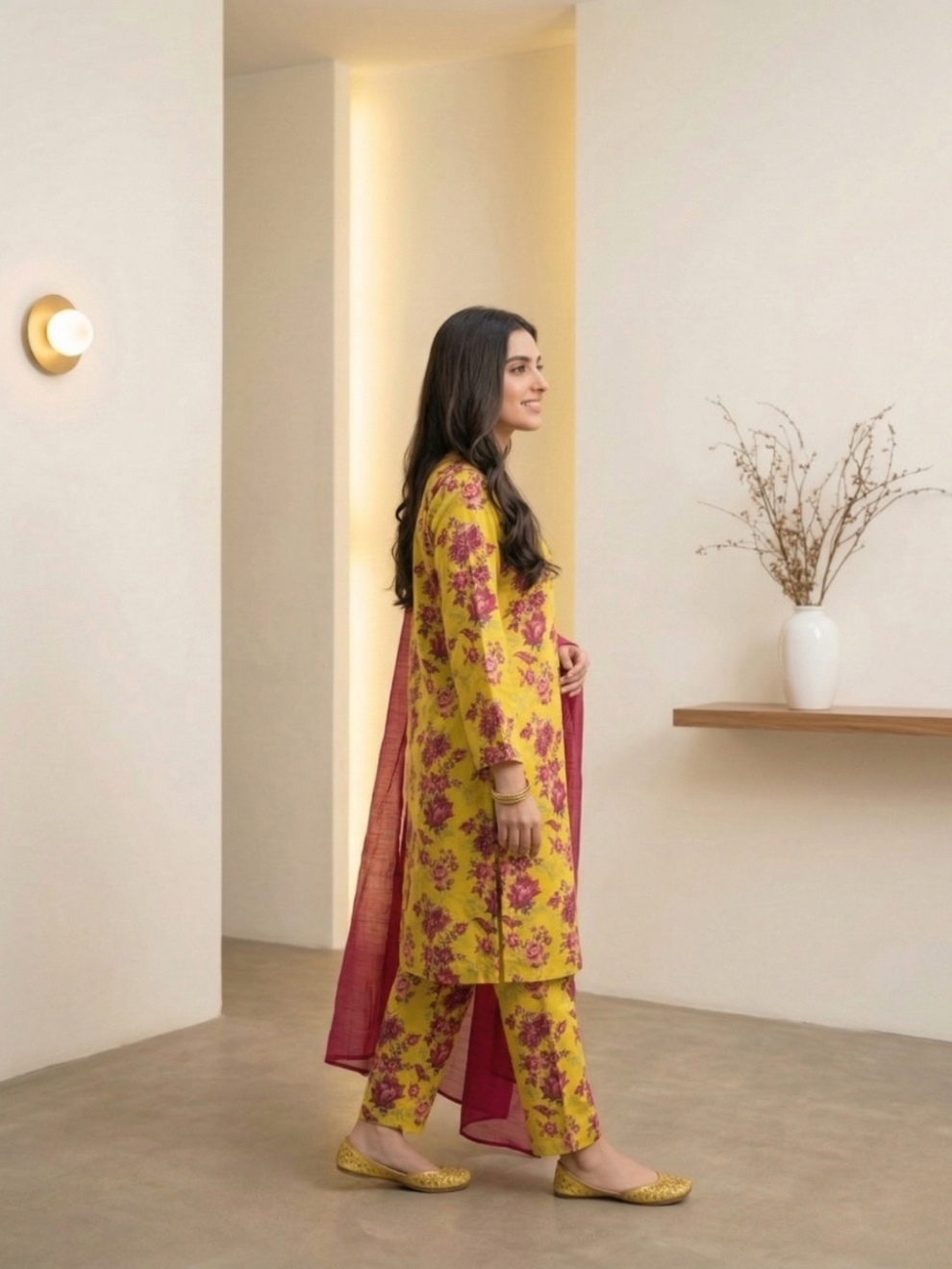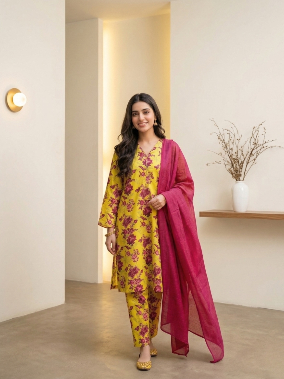 Dupatta: A lightweight, sheer solid magenta dupatta that drapes beautifully and perfectly complements the lively floral pattern of the outfit.